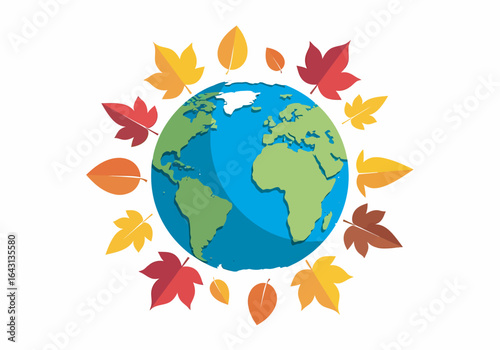Earth surrounded by colorful autumn leaves symbolizes environmental awareness and seasonal change, promoting sustainability and ecological balance in a vibrant and hopeful way.