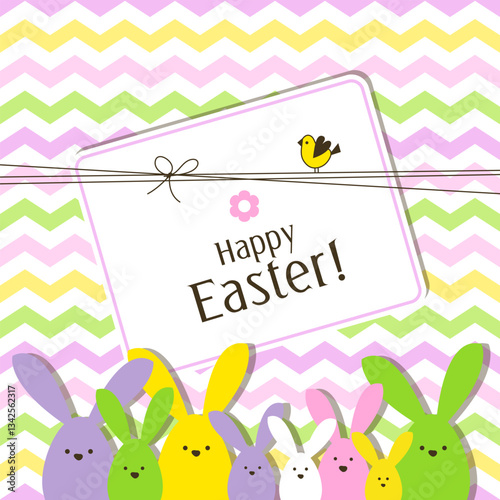 Easter Card with Colorful Bunnies and a Little Bird