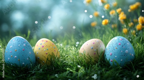 Easter eggs with colorful speckles resting on fresh grass with a soft dreamy background for a festive vibe. Generative AI