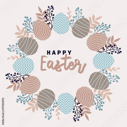 Easter greeting frame.Vector illustration with flowers and Easter eggs. Happy Easter greetings text. Design for web, site, banner, poster, card, paper print, postcard, flyer. Vector illustration
