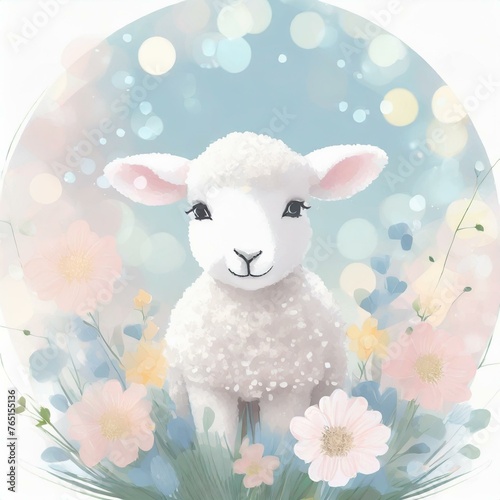 Easter lamb adorned with colorful springtime flowers. Cute clipart in pastel colours, bokeh light.