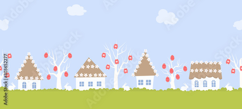 Easter village. Spring countryside landscape. Seamless border. There are Easter trees, houses with flower decorations, and rabbits in the picture. Vector flat illustration