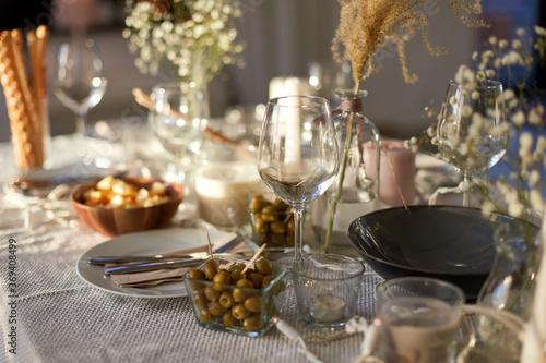eating, holiday and celebration concept - dinner party table serving at home
