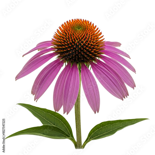 Echinacea flower isolated on transparent background – purple petals, dark cone with orange tips, green leaves.