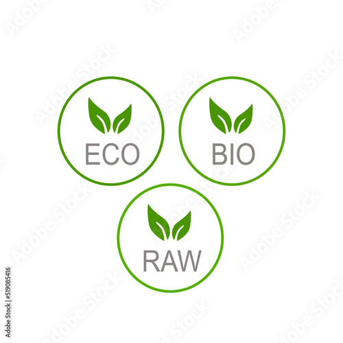 ECO, BIO, RAW LABELS ISOLATED ON WHITE BACKGROUND
