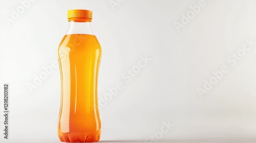 Eco Friendly Transparent Orange Beverage Bottle with Bright Orange Drink Against Soft White Background in Contemporary Setting