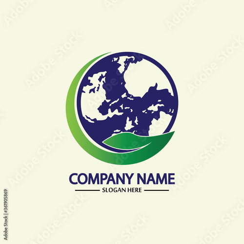 Eco World Nature Global Logo Design Template.World Globe Icon with Leaf Symbol around. Usable for Business, Nature, Environment, Science and Ecology Logos. Flat Vector Logo Design Template Element.
