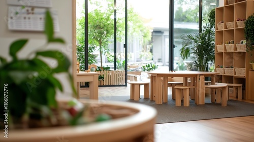 EcoFriendly Montessori Classroom with Indoor Plants and Natural Wooden Furniture : Generative AI