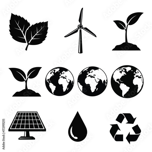 Eco-friendly symbols featuring leaves wind turbine solar panel globe and recycle icon set silhouette