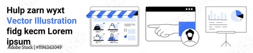 E-commerce website with storefront, online user interface for profile navigation, and data analytics presentation with pie chart. Ideal for online shopping, user interaction, business analytics, web