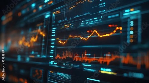 Economic analysis with charts and graphs on screens, analytical style, sharp focus, bright lighting, high detail