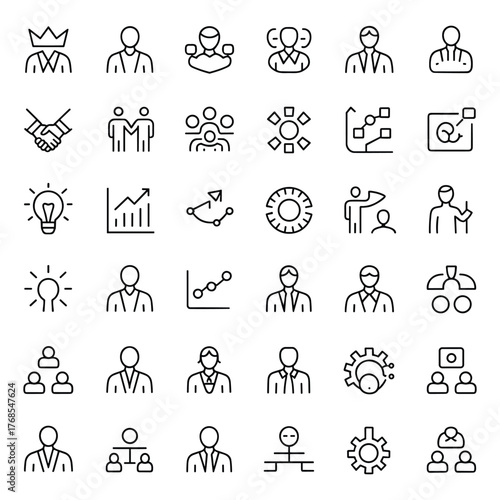 Editable Business & Leadership Line Icons, Minimalist Stroke Symbols of Teamwork, Strategy, Innovation, Workflow, Organizational Charts, and Decision-Making Tools