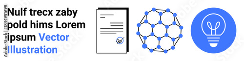 Education, innovation, technology, research, communication, creativity. Visual includes a document, molecular structure and light bulb. Innovation and communication concept
