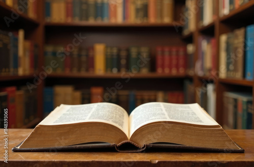 Education learning concept. Book in library with old open textbook, stack piles of literature text archive on reading desk, aisle of bookshelves in school study class room background for academic