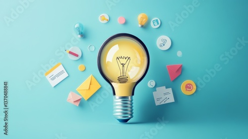 Educational growth and goal achievement concepts. Magnifying glass focuses on a light bulb representing ideas, surrounded by various education symbols. e-Learning, learning online, training course,