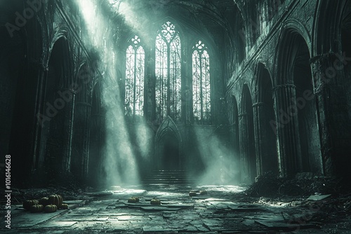 Eerie chapel setting ideal for Day of the Dead celebrations, evoking nostalgia and mystery, perfect for themed events, decor, and artwork.