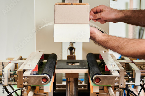 Efficient machine wraps rectangular packages with precision in manufacturing facility during busy production hours