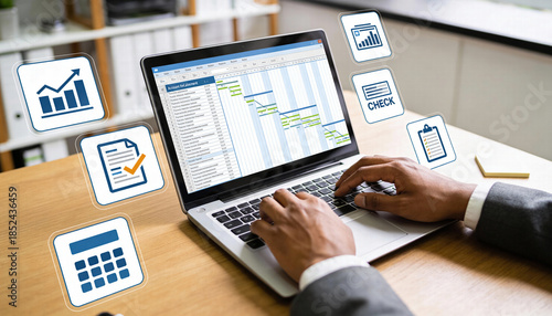 Efficient project management software displayed laptop, showcasing charts, checklists, and calculations, enhancing productivity and organization