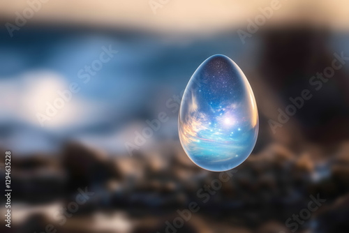 egg containing an entire universe against a blurry background of chaos