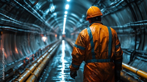 Egoutier dans un tunnel de drainage, equipe de sa tenue de travail, ambiance industrielle et sombre, illustration IA immersive et detaillee