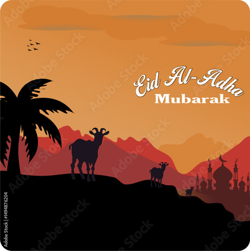 Eid al-Adha celebration. Greeting card with sacrificial lamb, date palm and mosque. Eid al-Adha theme. Vector illustration.
