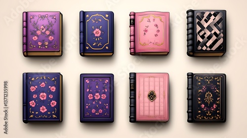 Eight beautifully decorated and stylized hardcover books are depicted here