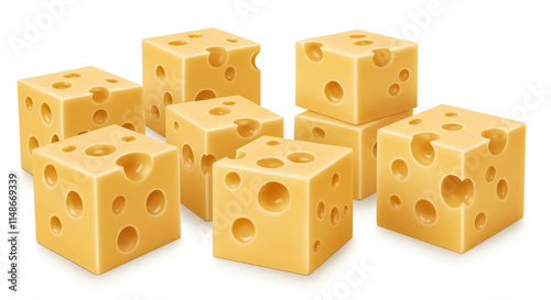Eight cubes of Swiss cheese with holes on a white background.