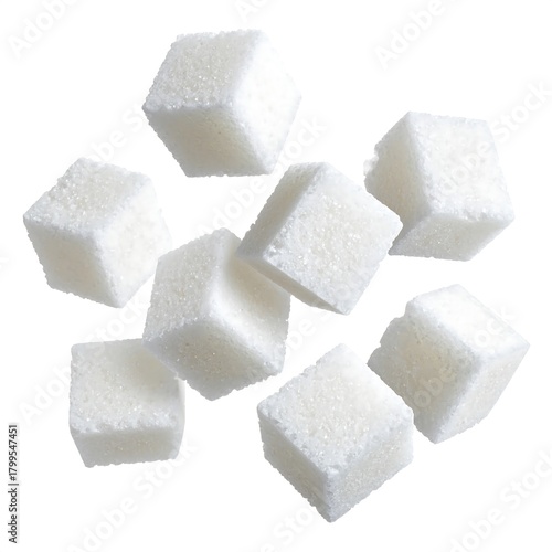 Eight refined sugar cubes are scattered in a chaotic arrangement.