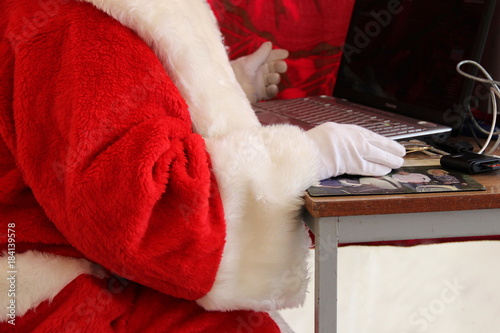 ein Mann verkleidet als Weihnachtsmann arbeitet am Laptop