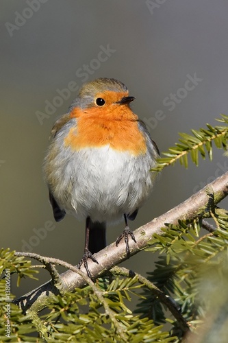 Ein Rotkehlchen steht auf dem Ast einer Hemlocktanne (Nahaufnahme)