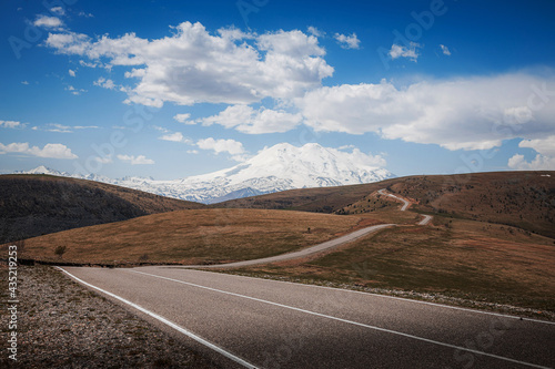 Elbrus And Green Hills with road At Sunny Summer Day. Dzhili-Su, Republic of Kabardino-Balkaria,North Caucasus, Russia.