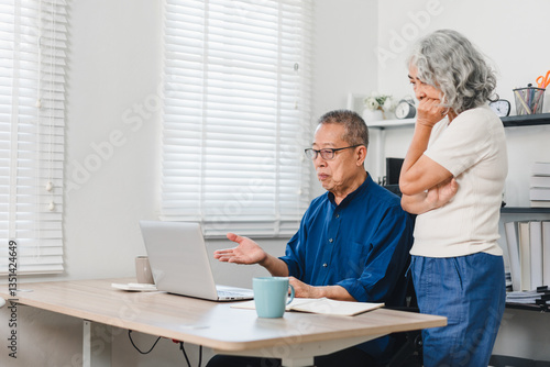 Elderly couple discussing pension savings while using laptop in bright home office, expressing concern and focus.