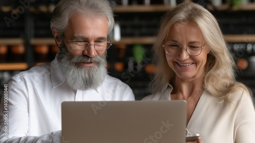 Elderly couple enjoying a shared moment while using a laptop together in a cozy indoor setting during the day