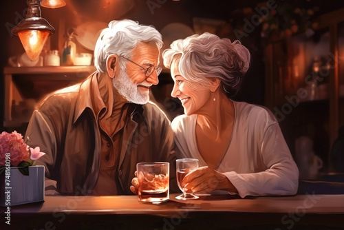 Elderly Couple Enjoying Wine Together in a Painting