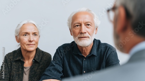Elderly couple listening attentively to financial advice from a professional in a modern office setting.