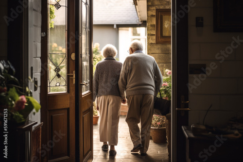 Elderly couple, man and woman; love at old age, helping one and other. Generative ai.