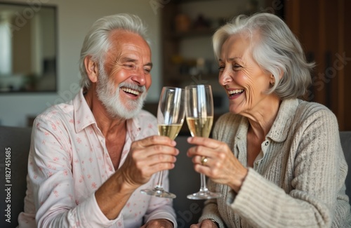 Elderly couple toasts with champagne, laughing heartily. They celebrate life, love, and a shared past in their cozy home, enjoying companionship and happiness together.