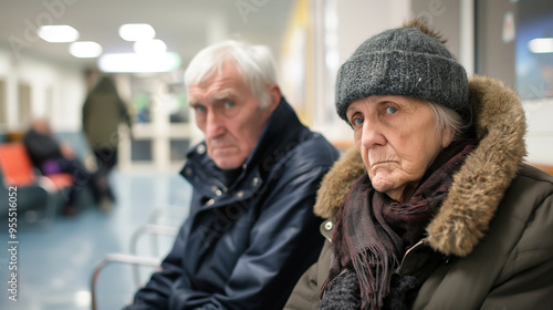 Elderly couple waiting in hospital waiting room feeling worried