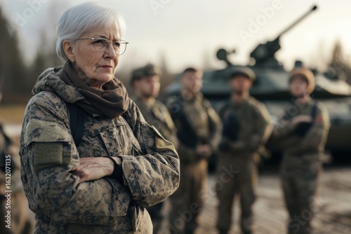 Elderly female tank driver mentors recruits at training facility highlighting leadership and support