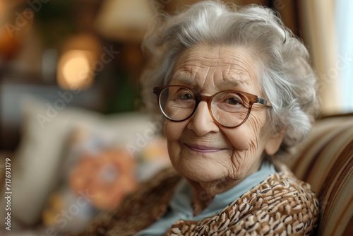 elderly female with glasses smiling while sitting on couch