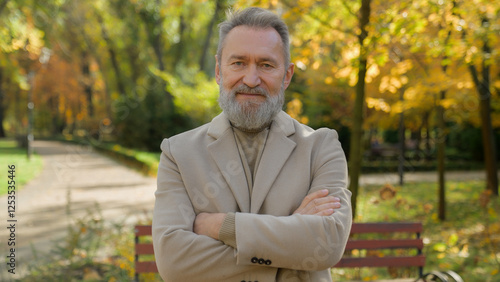 Elderly gray-haired male mature 60s man in autumn park alley outdoors old senior gentleman healthy smiling face happy portrait single pensioner crossed hands in elegant outerwear retirement in city