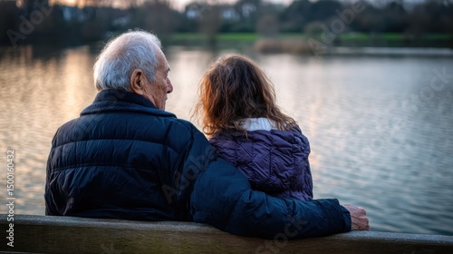 Elderly man and woman sitting on a bench by the lake with the man’s arm around her