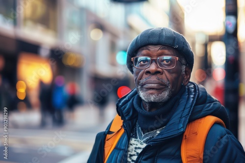 Elderly Man With Glasses and Beanie Standing on a Busy City Street During Sunset