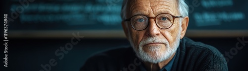 Elderly professor with glasses, classroom setting, serious expression, academic environment