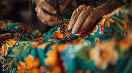 Elderly tailor's hands cutting and sewing a bright floral fabric with scissors and sewing machine