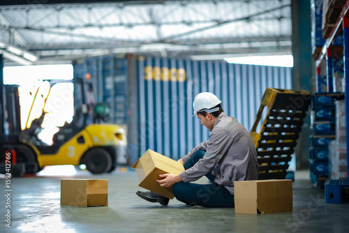 Elderly warehouse employee collapses during shift. Scattered packages highlight the importance of safety measures in industrial environments.