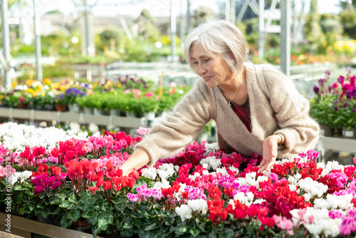 Elderly woman buyer chooses cyclamen in pot in flower shop..