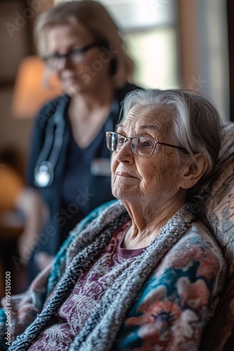 Elderly woman seated at home with nurse in glasses standing behind, warm atmosphere, natural lighting, focus on expressions, professional stock photo 4