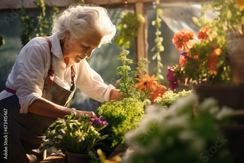 Elderly woman tending to plants