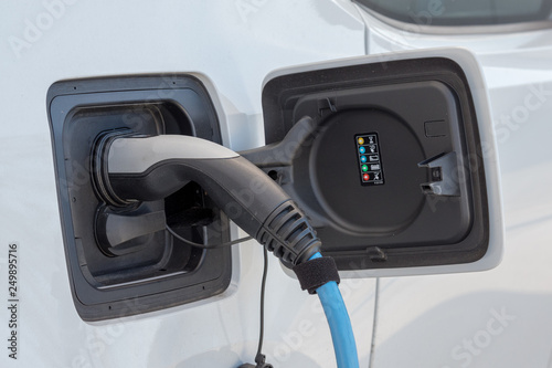 Electric car charged with plug at battery charging station